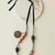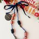 Scheletro's Arabic Geometric Design Necklace is a long necklace from the Arabic Geometric Beads Collection that features a mix of beads of different shapes and sizes woven together with a dark blue ribbon. The asymmetrical design showcases a dynamic aesthetic that is trendy and fashionable. Friends who like combination products are welcome to purchase matching necklaces and bracelets.