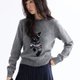 - Cat Jacquard Sweater. The cat graphic on the chest is whimsical and detailed, crafted with exquisite jacquard techniques. Animal silhouettes are woven with Fair Isle elements using different colored yarns on the main body of the sweater, creating a rich visual depth. The round neck, dropped shoulder, and slightly oversized silhouette are perfect for layering. The comfortable fit offers a structured look that is visually slimming, while the ribbed cuffs and hem provide warmth and protection against the cold.