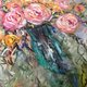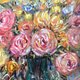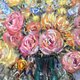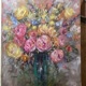 The composition features richly colored roses and mixed flowers in shades of blush pink, warm yellow, soft peach, sky blue, and hints of lavender, gathered into a loosely defined bouquet. Energetic pastel strokes and delicate blending create depth and softness, while spontaneous line work adds a contemporary, almost abstract rhythm to the piece. The muted, atmospheric background enhances the vibrancy of the flowers, allowing the bouquet to appear alive with light and motion.