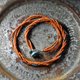 This is a four-strand necklace crafted from antique orange, light green, and indigo blue seed beads.