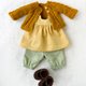 Doll is dressed in cotton jersey panties, cotton pants, cotton dress, knitted wool cardigan and crochet booties.