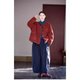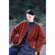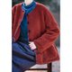 - Plush lamb fleece, rich and full. A charming outerwear piece that is both lightweight and warm. Featuring a round neckline, accented with a piece of blue floral fabric along the facing. A touch of this contrast peeks out at the placket and cuffs, while a rounded pocket is outlined, embodying feminine playfulness and the beauty of contrasting colors. The red of winter, rendered beautifully, with a depth of color and richness.
