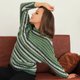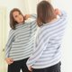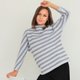 The sweater is a little bit of a slim fit, made up of two front and back parts, which are joined along the sides and sleeves. The armhole is quite low; it begins above the waist and its volume decreases from the shoulder to the wrist.