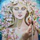 The picture shows an image of an apple tree, a blonde girl with blue eyes is depicted, her hair is decorated with apple blossoms. The background of the painting is made in turquoise tones with small stars and sparks, creating a feeling of a galaxy of spring. The apple tree symbolizes beauty, life and renewal, and the brilliance of the stars adds a picture of magic and greatness. All together, it creates the impression of the mystery and grandeur of nature, forcing the viewer to think about the endless transforming beauty of the world around us.
