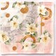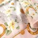 This elegant handkerchief features a delicate white plumeria (frangipani) floral motif, beautifully combined with gold-tone coin and ring emblems set within an ornate decorative frame.