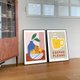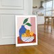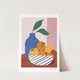 A still-life painting featuring oranges and leaves in a large vase, using soft colors. This art print carries a vintage vibe that will add a cool touch to your space.