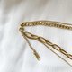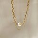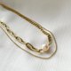 This necklace features natural Baroque pearls and a layered steel chain in a warm gold tone. Its subtly irregular and asymmetrical design is a thoughtful combination that allows you to showcase your unique charm and radiance.