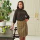 The crochet skirt fabric does an impression of a tweed fabric. Wrap skirt with a snap closure is designed for a fall-winter-spring season. Soft seamless textured fabric is made in a simple pattern with yarn of different colors.