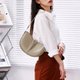 An elegant half-moon silhouette complemented by a casually long strap with a buckle closure.