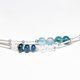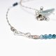 - A delicate necklace featuring icicle-shaped kyanite, abundant Indian silver bells, blue-green agate, indigo blue beads & herkimer diamonds, and fine cylindrical silver beads.