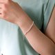 The length is adjustable from 17 cm to 19cm by fastening the clasp at different points. A single Keshi pearl is delicately attached to the end of the adjuster chain, swaying gently for a charming finishing touch.