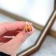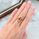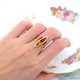 - This uniquely shaped 925 sterling silver ring resembles a pointed leaf, featuring two cylindrical natural amber stones set in the center—one yellow and one orange—that beautifully complement each other. The inner band is engraved with a "925" hallmark. The ring is in excellent condition and gives the appearance of elongating the fingers when worn.