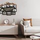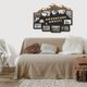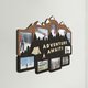 - Wooden photo frame collage decorated with mountains, forest, and a tent with fire as well as adventure awaits text in the middle. This collage is 59 centimeters high and 79 centimeters wide and has 10 frames. Trees and mountains can be painted in different colors. The text can be changed. This collage will be a wonderful gift and a fine piece of decor.