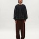The neckline and cuffs are finished with raw edges. After washing, these areas naturally develop irregular pleats and curled edges, contributing to the overall vintage aesthetic. The "fried snowflake" technique, involving tumbling with friction and chemical treatment, creates random white mottled textures across the garment, resulting in a unique snowflake effect. This process further enhances the fabric's softness and wearing comfort.