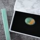 This obidome features the natural stone "Green Aventurine," with its captivating deep green hue, complemented by the osmanthus motif, symbolizing autumn, and Kanazawa gold leaf. The soft green of the aventurine enhances the orange of the osmanthus, while the delicate shimmer of the gold leaf adds a touch of seasonal elegance to Japanese attire.