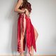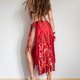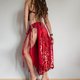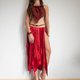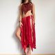 Tribal split skirt with tie closure in red. It is decorated with fabric braids, fringe and glitter.