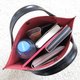 ◎ This tote is elegantly finished with a thick, firm red shrink leather featuring a grid-like texture, contrasted with black handles and stitching. (^^)