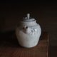 - Several delicate blue lines encircle the lid, subtly blurring within the wood firing process, reminiscent of concentric circles drawn in a light mist. These echo the gentle glaze flow and fire marks around the pot's shoulder.