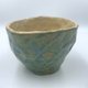 The exterior features a blue-green glaze, while the interior is a sandy white.