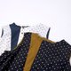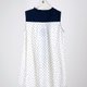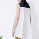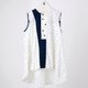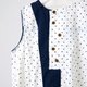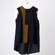 - / Round neck sleeveless top / Polka dot and solid fabric color blocking / Half-placket offset button design / High-low flared hemline to flatter the silhouette