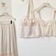 Trimmings: French Leavers Lace, hand-dyed silk ribbon, imported Japanese double-sided pearl luster satin ribbon