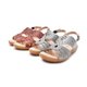 - Leather buckle strap design for easy on and off Added elastic strap for comfort and relief on the instep Perforated, breathable design enhances texture
